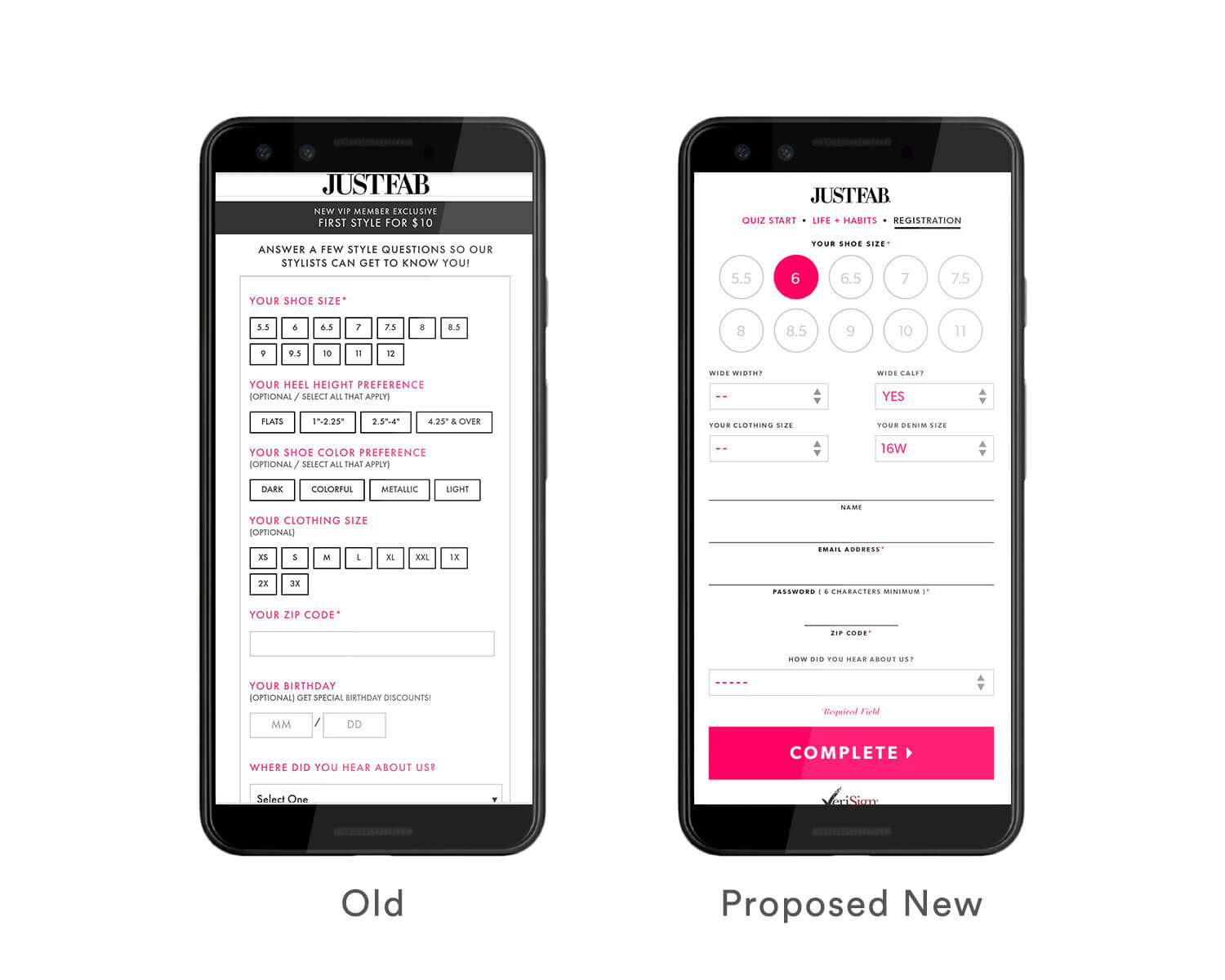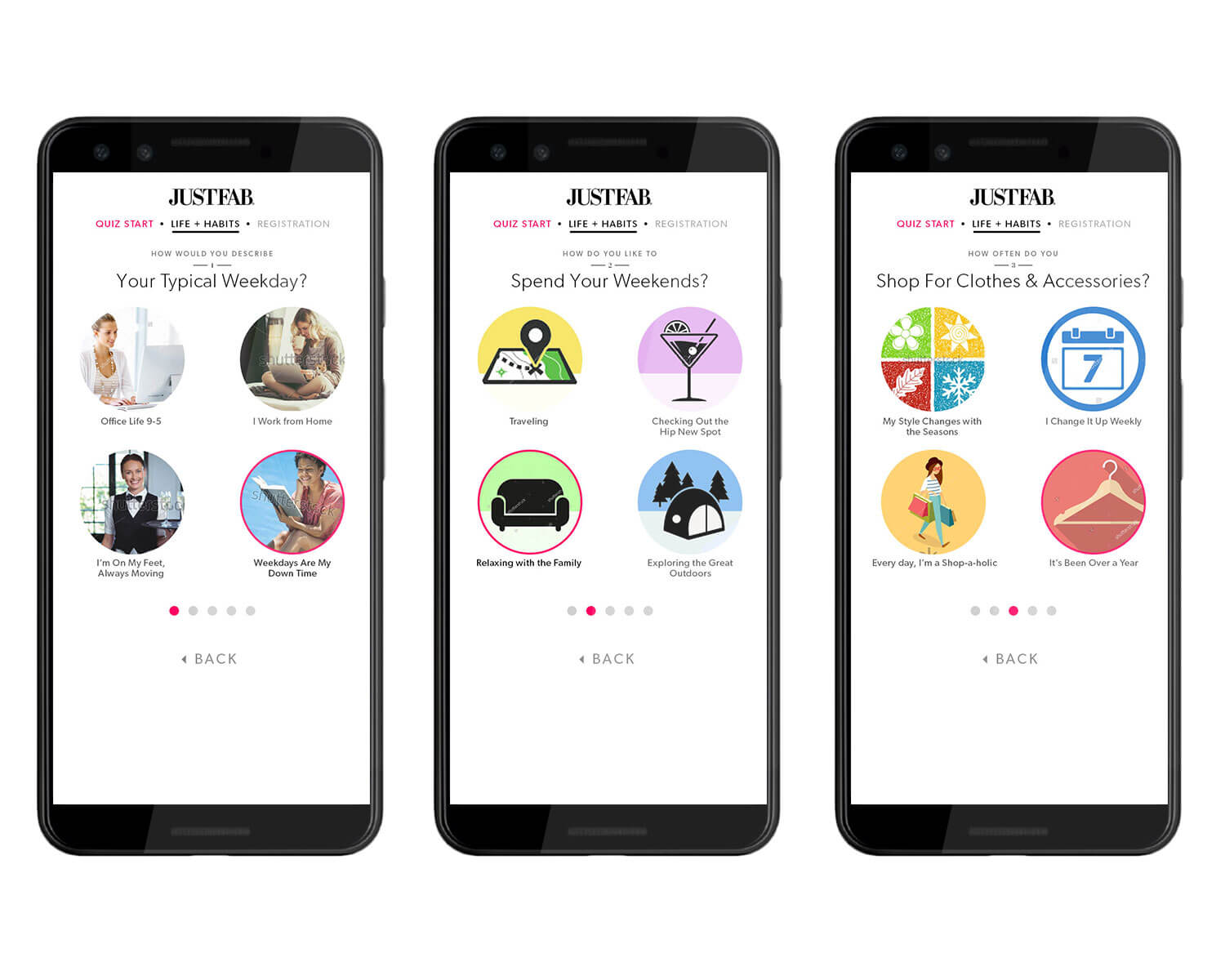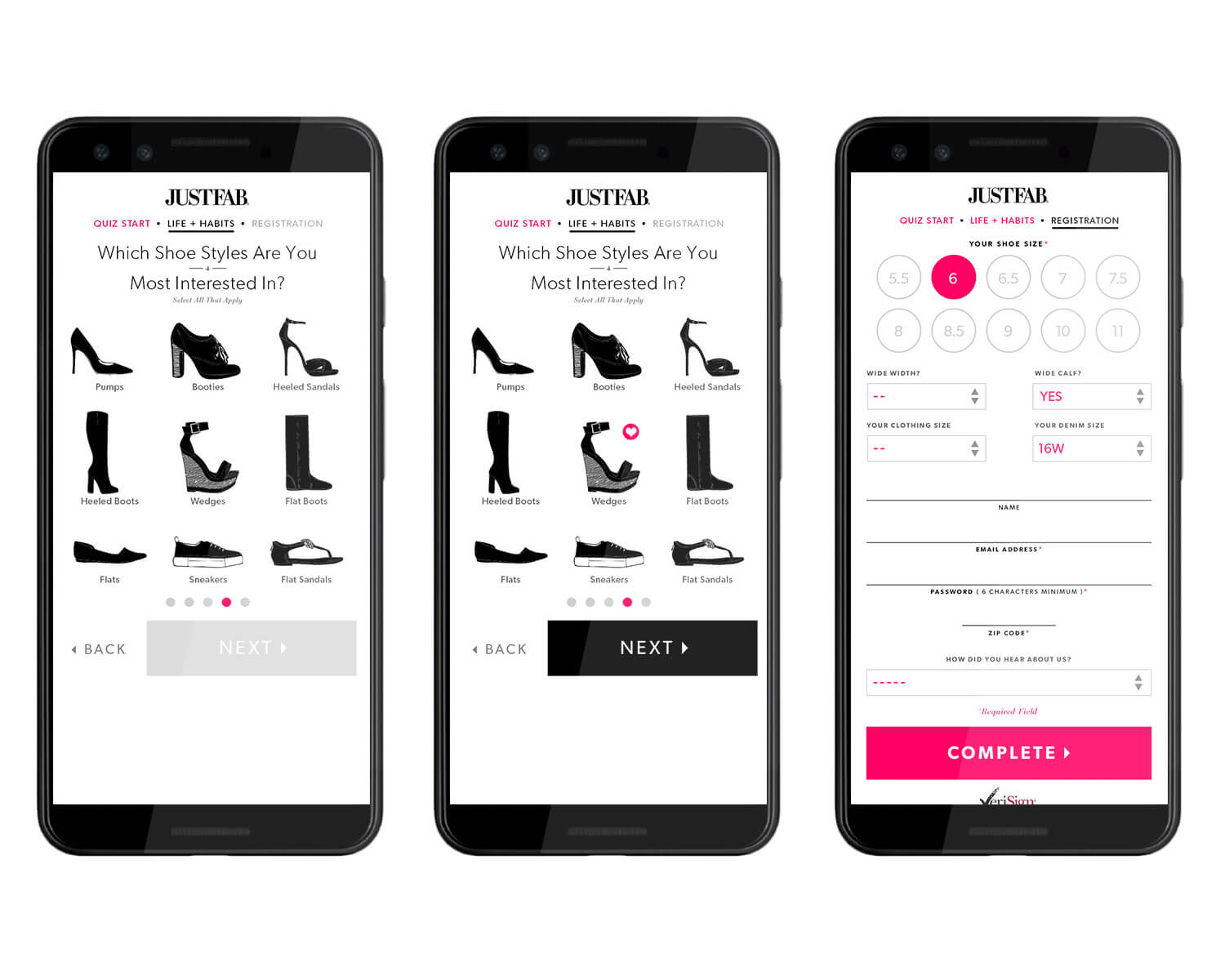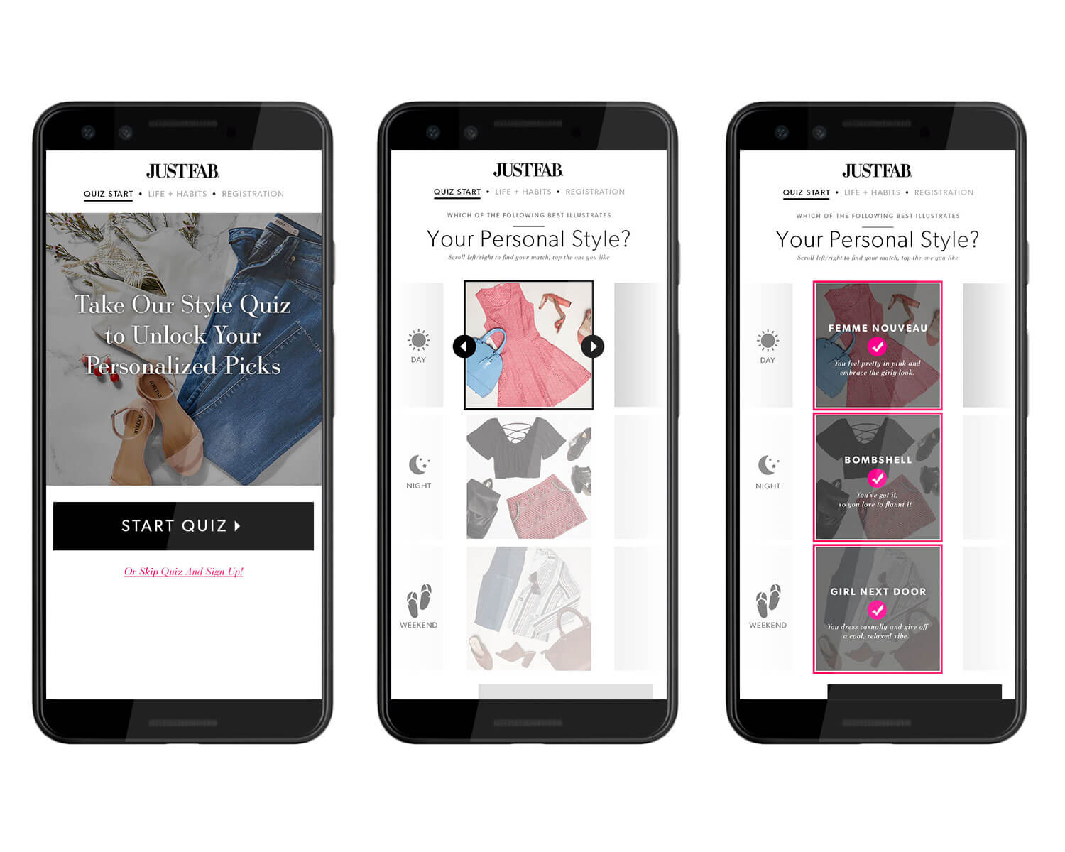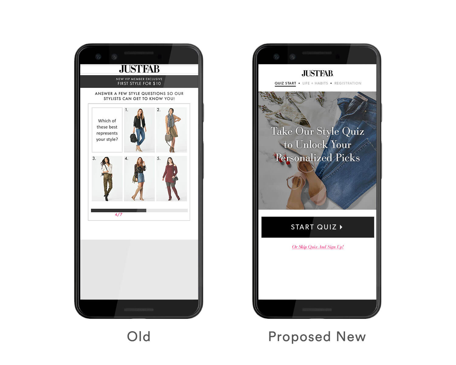 In 2017, Techstyle - the parent company of multiple online subscription based women's fashion brands like JustFab and Fabletics, was looking to revamp their introductory style quiz that potential subscribers will take before signing up. The goal was to present a more user-friendly, intutive and engaging quiz to increase customer acquisition as well as customer profile building. The old quiz page was not ideal for mobile devices (75% of traffic coming to the quiz was through mobile devices) so a major emphasis was placed on making the quiz mobile-friendly.